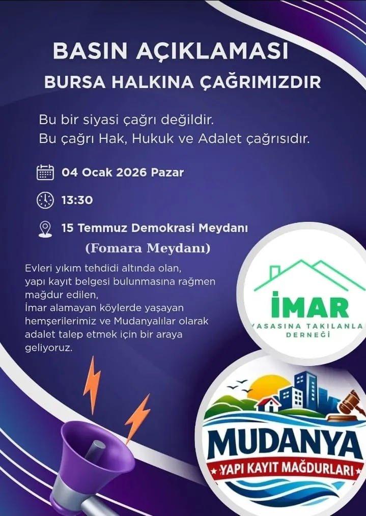 İmar Yasasına Takılanlar Derneği, başta Bursa Mudanya olmak üzere Türkiye’nin pek çok noktasında milyonlarca yapıyı ilgilendiren yıkım kararlarına karşı sert bir bildiri yayınladı. Dernek, mülkiyet hakkının korunması ve imar planlarının ivedilikle tamamlanması için yetkililere çağrıda bulundu.
