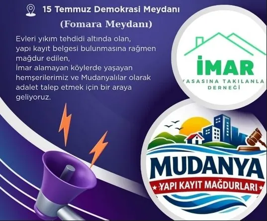 İmar Yasasına Takılanlar Derneği, başta Bursa Mudanya olmak üzere Türkiye’nin pek çok noktasında milyonlarca yapıyı ilgilendiren yıkım kararlarına karşı sert bir bildiri yayınladı. Dernek, mülkiyet hakkının korunması ve imar planlarının ivedilikle tamamlanması için yetkililere çağrıda bulundu.